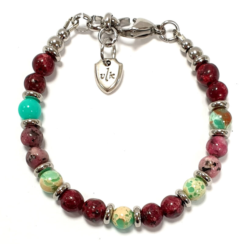 - [MATERIALI]: acciaio, pietre dure. Il bracciale è composto da VERE pietre dure. Le perline sono montate su una ROBUSTA e RESISTENTE catenina in acciaio. Il bracciale è leggero e comodo; può essere indossato tutti i giorni e non si rovina a contatto con l’acqua.