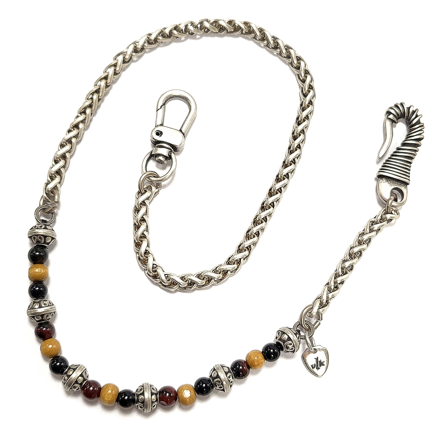 Freya è una catena da pantaloni realizzata a mano in cui materiali di diversa composizione e colore vengono abilmente abbinati. A rifinire il tutto un moschettone in un lato e un gancio dall’altro.
